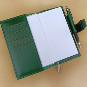 Krásný zelený kožený obal na týdenní diář, který je ručně vyroben z italské hovězí kůže, přinese do Vašeho plánování potěšení. Obal lze konfigurovat, zvolit jinou barvu kůže, nitě, anebo i ražbu Vašeho monogramu pro ještě více individualizace. Obal dodáváme bez diáře.