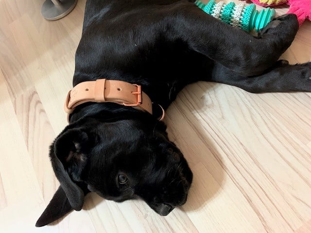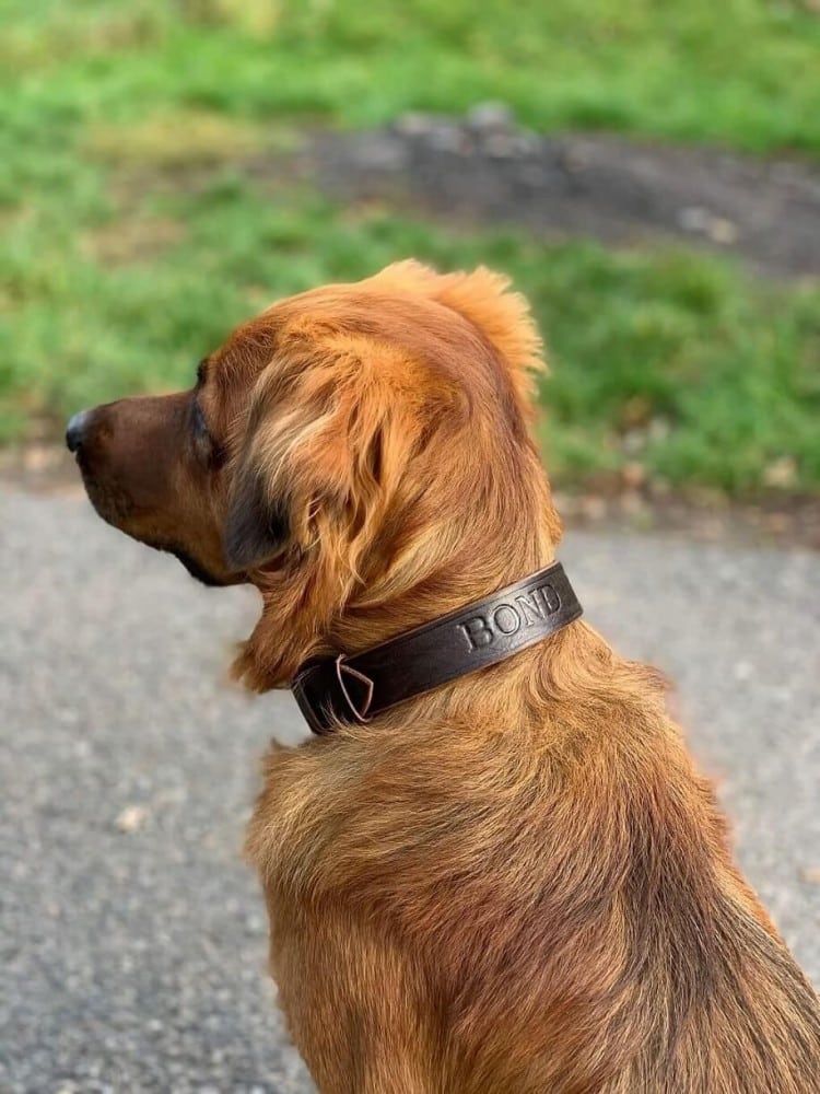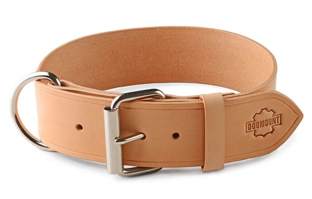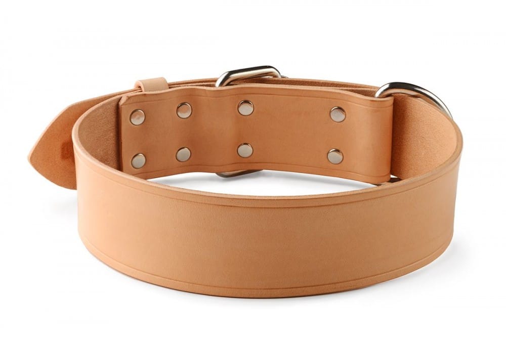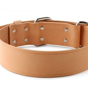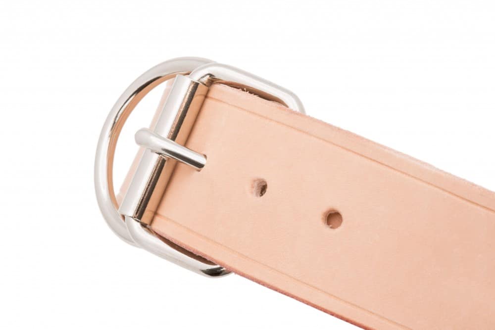 Ručně vyrobený kožený obojek pro psa nýtovaný, bez prošívání, jedna vrstva přírodní světlé hovězí hlazenice o šíři pouze cca. 2,5 mm. Použitá hlazenice z alpských krav vyniká vyšší tuhostí, její činění probíhá v Itálii nebo Německu za použití jednoho z nejstarších způsobů vyčiňování usní – třísločiněním. V základu našich kožených obojků pro psy použita sedlářská niklová přezka s rolnou.