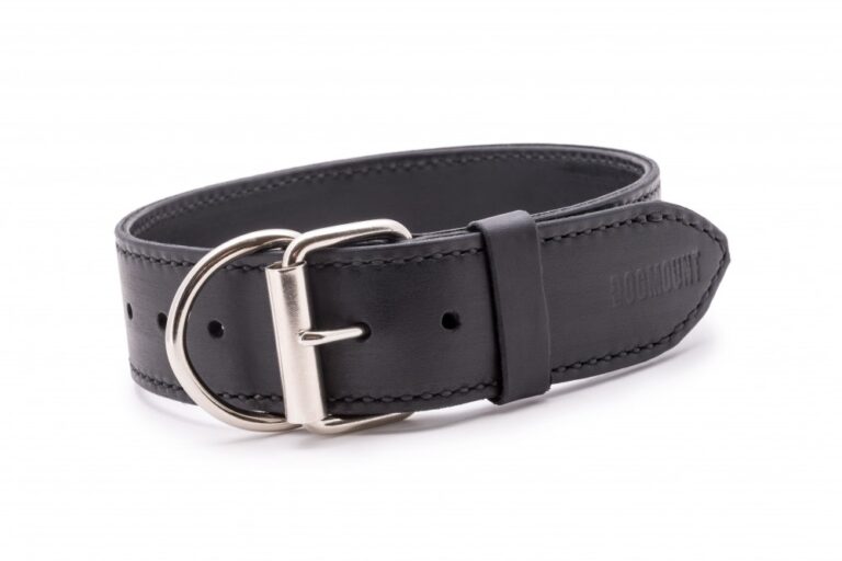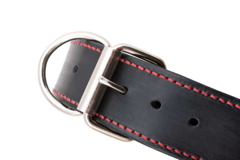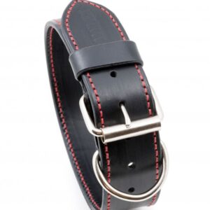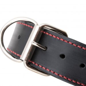 Ručně vyrobený kožený obojek s ručním prošitím z černé hovězí hlazenice. Použitá hlazenice z alpských krav vyniká vyšší tuhostí, její činění probíhá v Itálii nebo Německu za použití jednoho z nejstarších způsobů vyčiňování usní – třísločiněním. Barvené hlazenice jsou pak chromočiněné. Dvě ručně prošívané vrstvy voskovanou vysokopevnostní nití s celkovou tloušťkou cca. 4 – 5 mm zajistí maximální bezpečí Vašeho pejska. V základu našich obojků pro psy použita sedlářská niklová přezka s rolnou. Obojek je vhodný pro všechny typy plemen, stačí jen nastavit vhodné parametry.