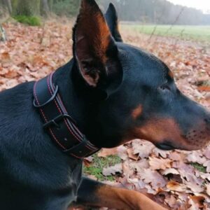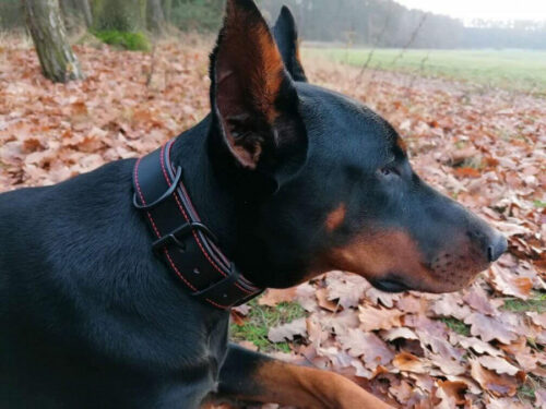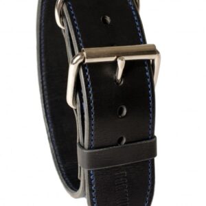 Ručně vyrobený kožený obojek s ručním prošitím z černé hovězí hlazenice. Použitá hlazenice z alpských krav vyniká vyšší tuhostí, její činění probíhá v Itálii nebo Německu za použití jednoho z nejstarších způsobů vyčiňování usní – třísločiněním. Barvené hlazenice jsou pak chromočiněné. Dvě ručně prošívané vrstvy voskovanou vysokopevnostní nití s celkovou tloušťkou cca. 4 – 5 mm zajistí maximální bezpečí Vašeho pejska. V základu našich obojků pro psy použita sedlářská niklová přezka s rolnou. Obojek je vhodný pro všechny typy plemen, stačí jen nastavit vhodné parametry.
