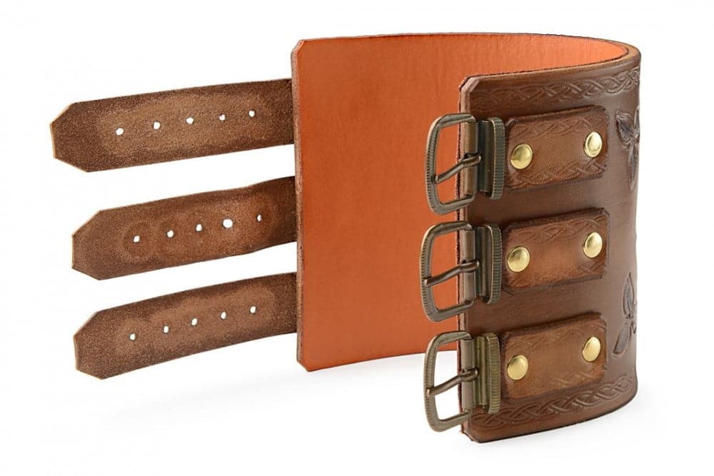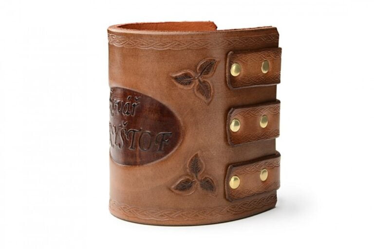 Kožený stahovací náramek pro podpěru zápěstí zcela ručně vyrobený původně pro kováře. Na zakázku Vám můžeme podporu zápěstí upravit a vyrobit přesně podle Vašeho očekávání. Ať už z hlediska rozměrů, počtu stahovacích pásků nebo ornamentů.