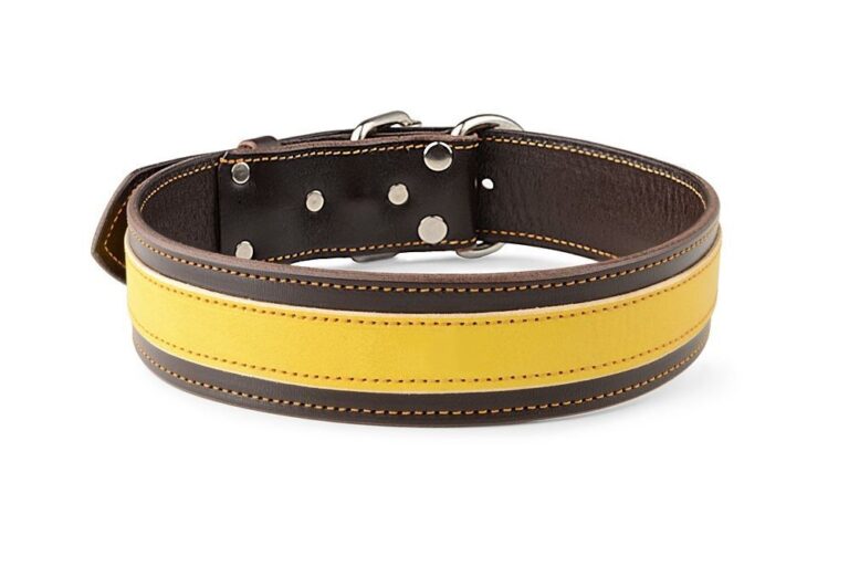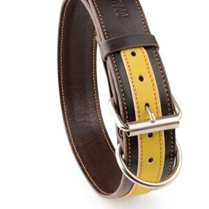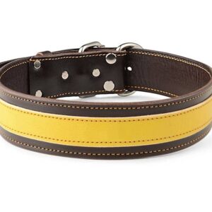 Obojek kožený vyrobený z tmavě hnědé a žluté hovězí hlazenice je strojově prošit žlutou vysokopevnostní voskovanou nití. Použité hlazenice bývají činěné v Německu nebo Itálii. V základu koženého psího obojku použita sedlářská niklová přezka s rolnou. Obojek je vhodný pro všechny typy plemen bez ohledu na to, zda se jedná o malé, střední nebo velké psy, stačí jen nastavit vhodné parametry.