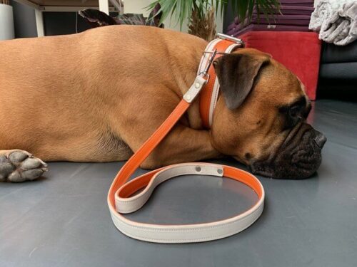 We received the collar and leash monday the 29th! Perfectly on time! It fits like a glove and we are very happy with the nice work you did. It looks great on her (and yes 5 cm is much better than 4!). Unlike us Lola didn’t care about her new collar but the cookie in the packaging (present is a much better word) she loved very much! Thanx again! Francy and Lola, Netherlands