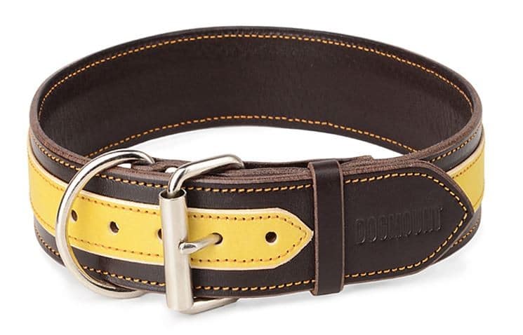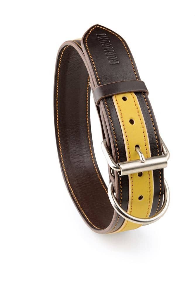 Obojek kožený vyrobený z tmavě hnědé a žluté hovězí hlazenice je strojově prošit žlutou vysokopevnostní voskovanou nití. Použité hlazenice bývají činěné v Německu nebo Itálii. V základu koženého psího obojku použita sedlářská niklová přezka s rolnou. Obojek je vhodný pro všechny typy plemen bez ohledu na to, zda se jedná o malé, střední nebo velké psy, stačí jen nastavit vhodné parametry.