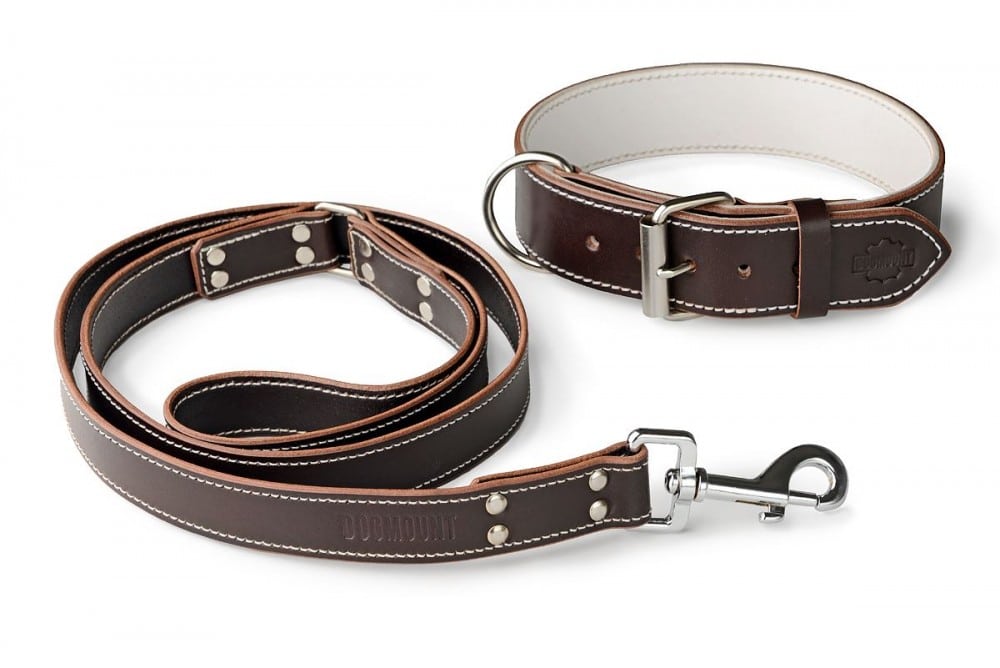 Kombinace dvou krásných ručně vyrobených produktů. Dvouvrstvý kožený hnědobílý kožený obojek, který je i ručně prošitý a vhodný i pro velké psy, lze stylově doplnit i hnědým obojkem s bílým prošitím. Kožený set může být vhodný pro všechna psí plemena, stačí si jen nastavit vhodné parametry.